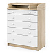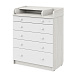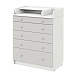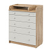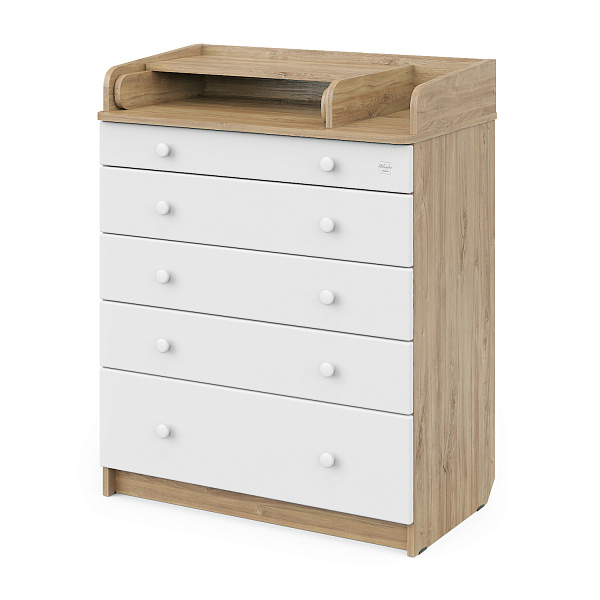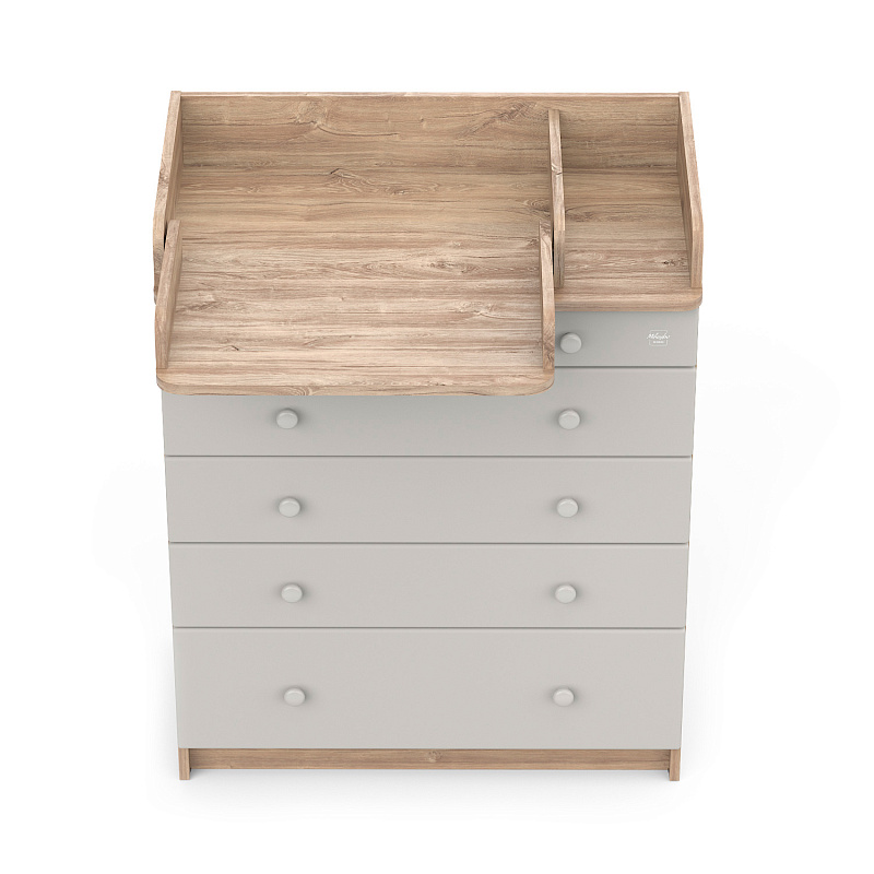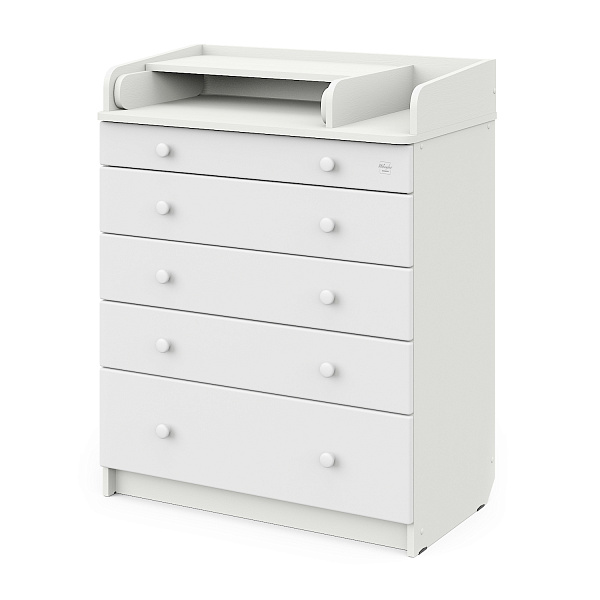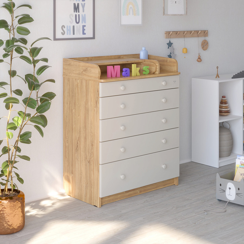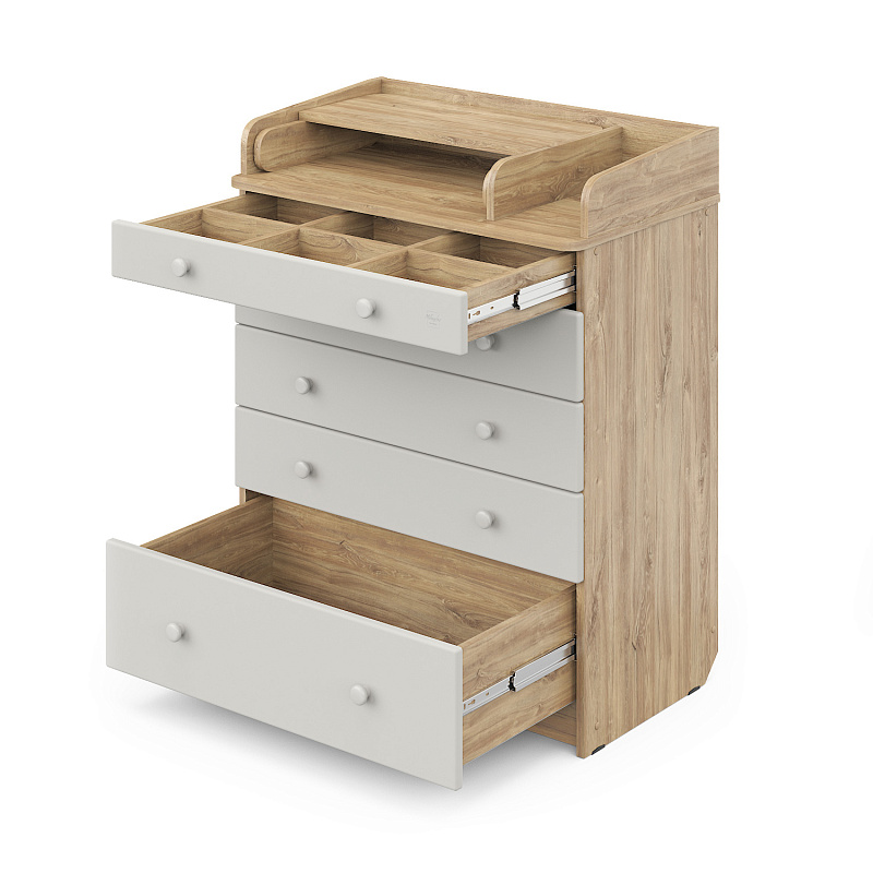 В комоде MAKS пять выдвижных ящиков на шариковых направляющих. Оборудован пеленальный столик с простым и надежным скрытым механизмом раскладывания. Производителем предусмотрено отделение для средств гигиены с быстрым доступом.