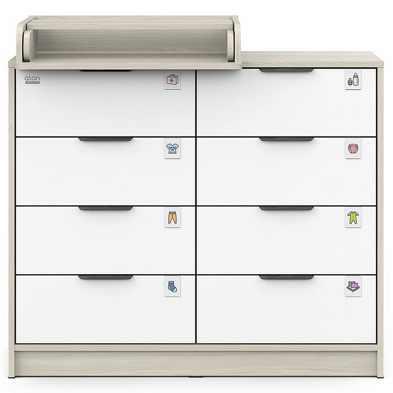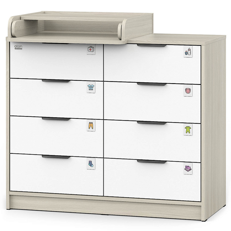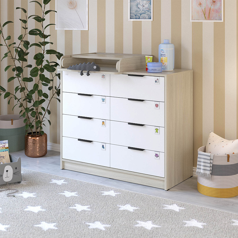 Комод “Зевс” оснащен восемью ящиками и пеленальной доской. Сочетает в себе функциональность и стиль для заботы о ребенке.
