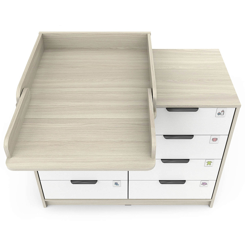 Пеленальный столик съемный, легко устанавливается и убирается без следов на столешнице: в этом помогают металлические втулки, которые надежно фиксируют его на заднем торце. Пеленальная доска устанавливается в трех разных местах: слева, справа и по центру.