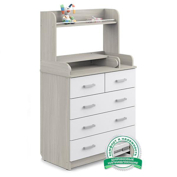 В этом комоде пять ящиков — три широких нижних и два верхних, которые в ширину равны нижним ящикам. Ящики находятся на шариковых телескопических направляющих, а значит работают плавно, без шума, не выезжают произвольно. Наверху оборудован пеленальный столик. Рядом — отделение для средств по уходу за ребенком. С полки предметы не скатываются благодаря ограничителю.