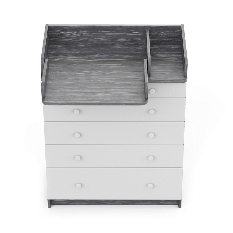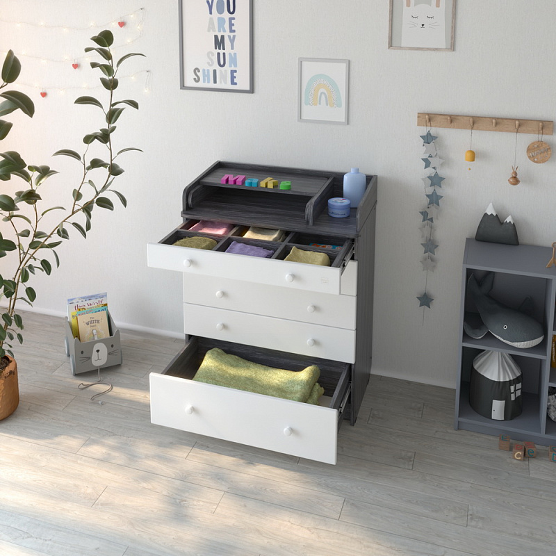 В Maks применяется столик для пеленания с простой и надежной системой раскладывания. Рядом с пеленальным столиком предусмотрено отделение для средств по уходу за ребенком. Комод весьма вместительный, включает пять ящиков, установленных на надежные шариковые направляющие с бесшумным ходом. Один из ящиков — нижний — имеет большую глубину, а верхний оснащен органайзером для более удобной сортировки детских вещей.